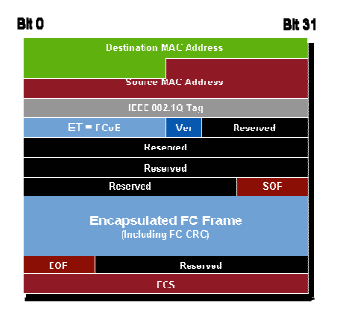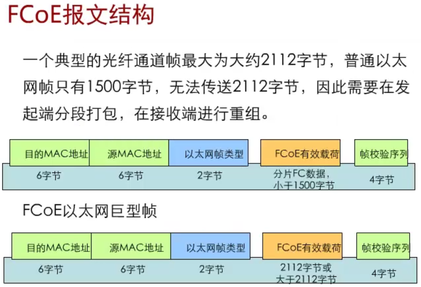 每个 FCoE 数据包只能包含 一个完整的 FC 帧(一对一封装) (维基百科)