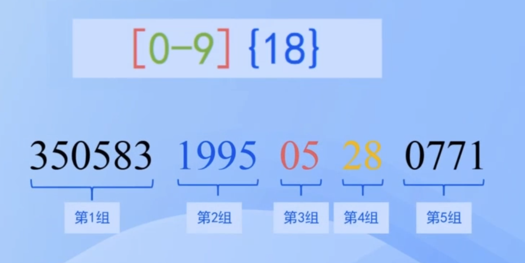 将身份证进行分组【小括号表示分组、中括号表示查找的数字范围、大括号表示长度】