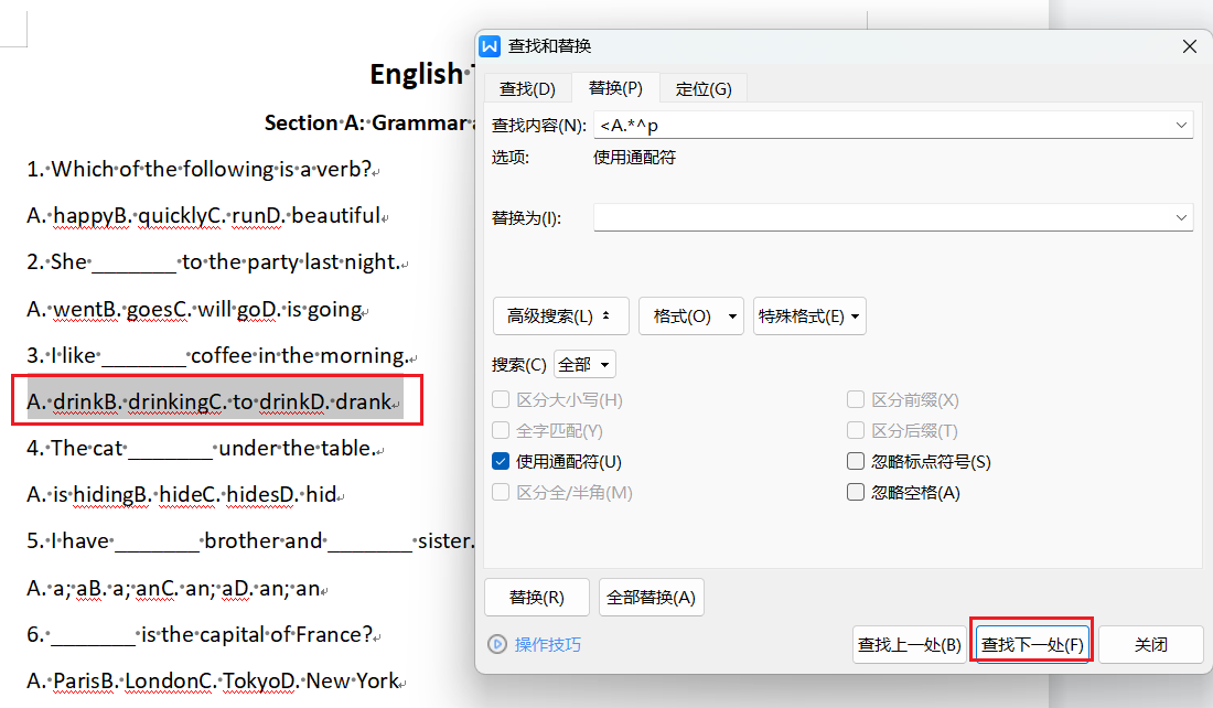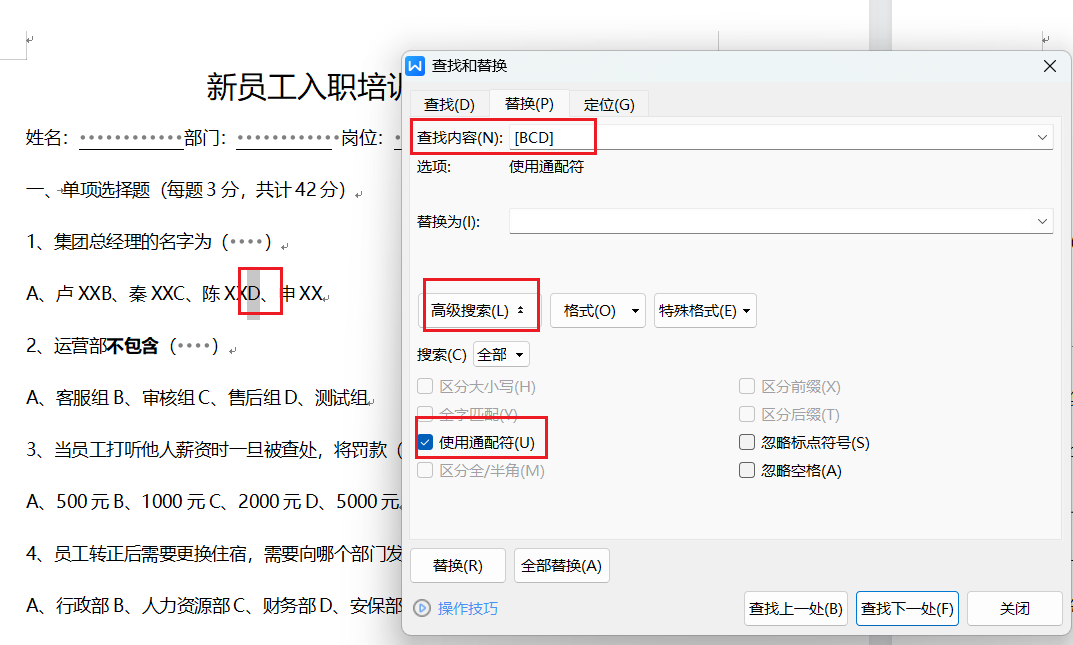查找替换后的内容如下所示,但是有缺陷,如果选项内容出现了BCD字母查找会失效。
