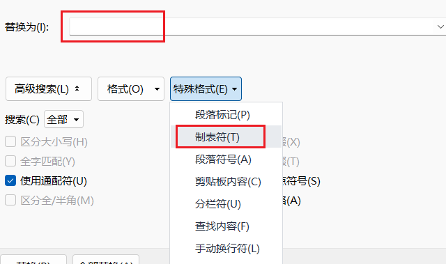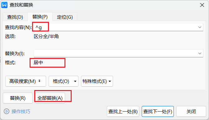 然后在替换为对话框里,选择格式-段落-对齐方式选择居中对齐
