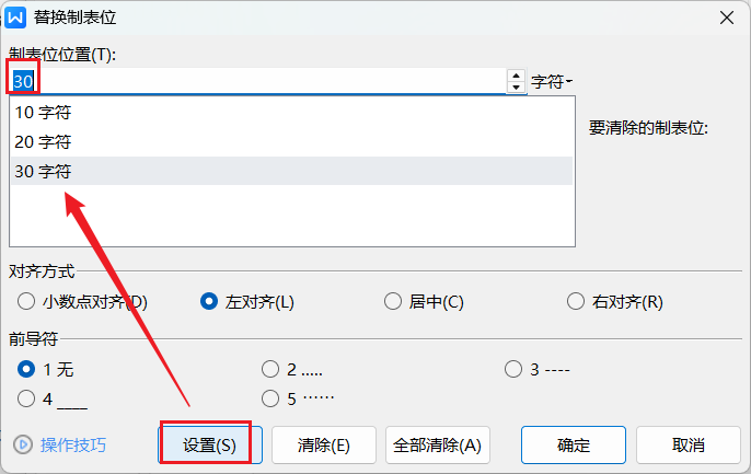 然后按照要求设置制表位的位置,在10、20、30字符处都有一个左对齐的制表位