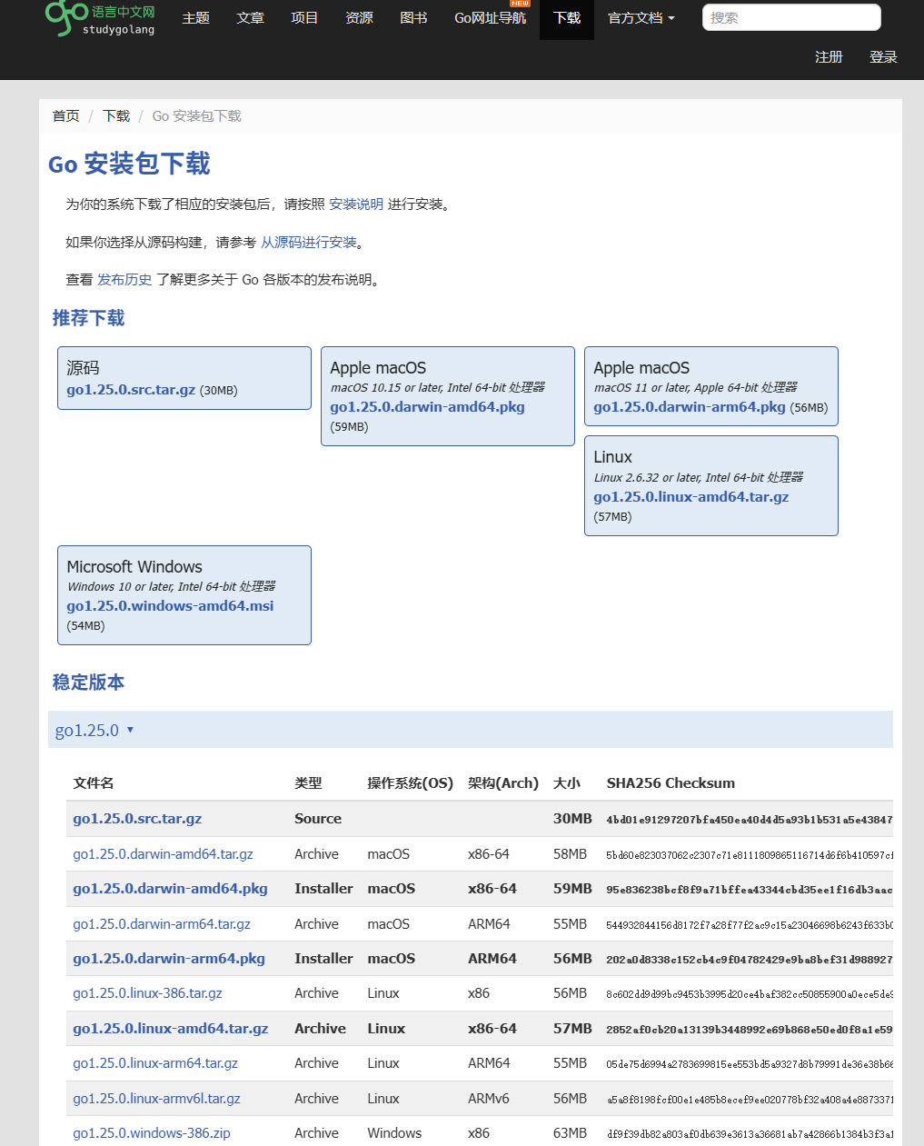 到 https://studygolang.com/dl 上下载最新的Go稳定版本。
