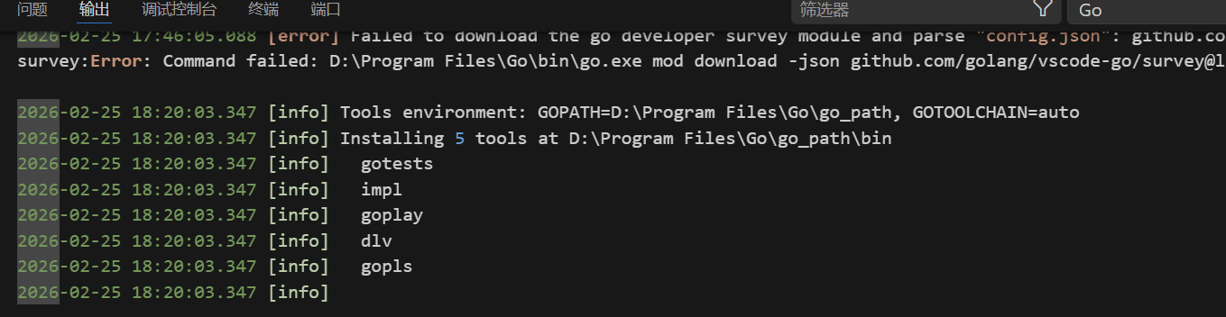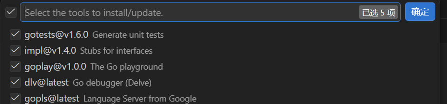 出现提示时,选择所有可用的 Go 工具,然后选择“确定”。