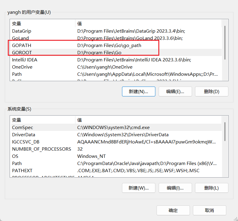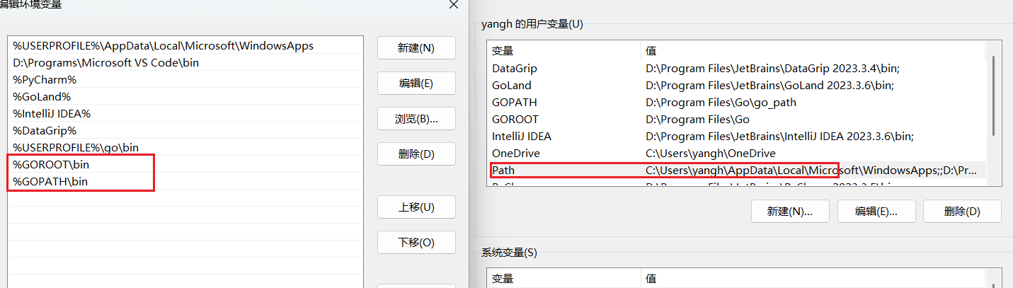 对于Windows用户,编辑用户环境变量,新增GOROOT和GOPATH,把GOROOT/bin和GOPATH/bin添加到Path里。如下图