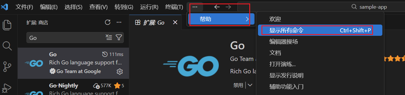 在 Visual Studio Code 中,打开 命令面板的 “帮助>显示所有命令”。 或使用键盘快捷方式(Ctrl+Shift+P)