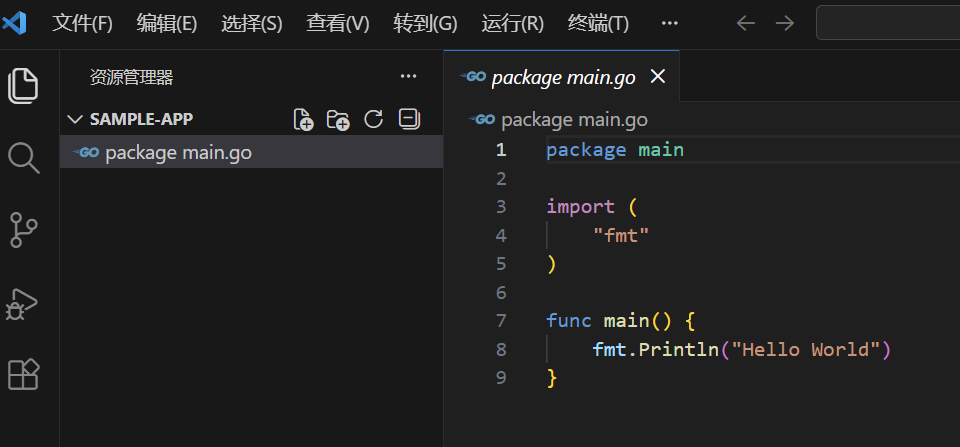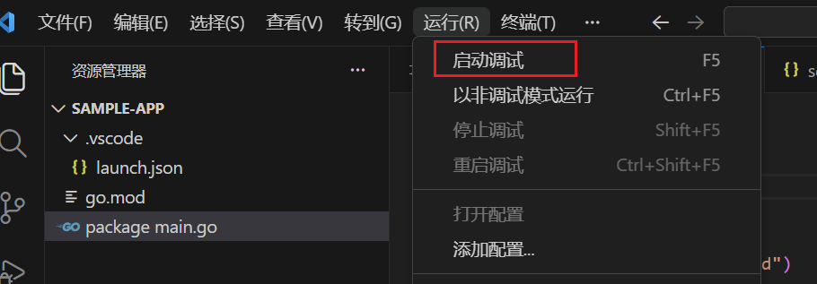 在 Visual Studio Code 中,打开 Go 应用程序的根目录。 若要打开文件夹,请在活动栏中选择资源管理器图标,然后选择“ 打开文件夹”。