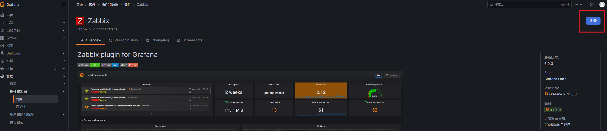 但是zabbix的插件具有滞后性,目前最新版本的Zabbix为6版本,并且依赖的Grafana的版本要大于11.6