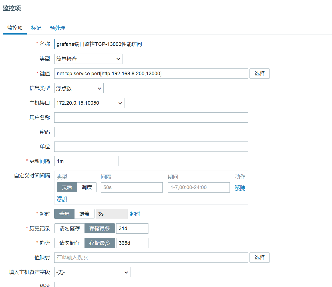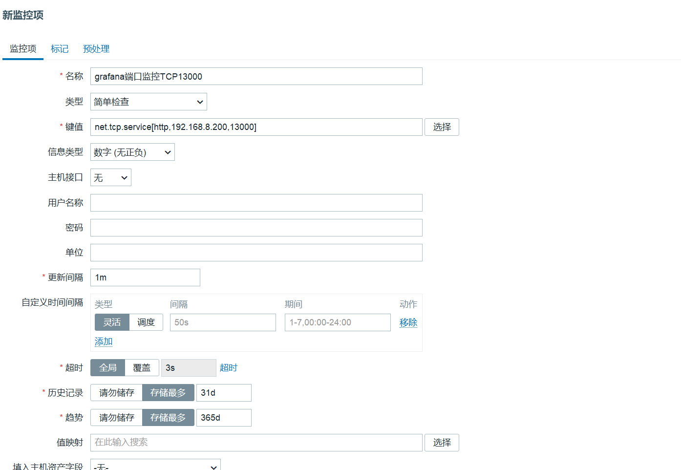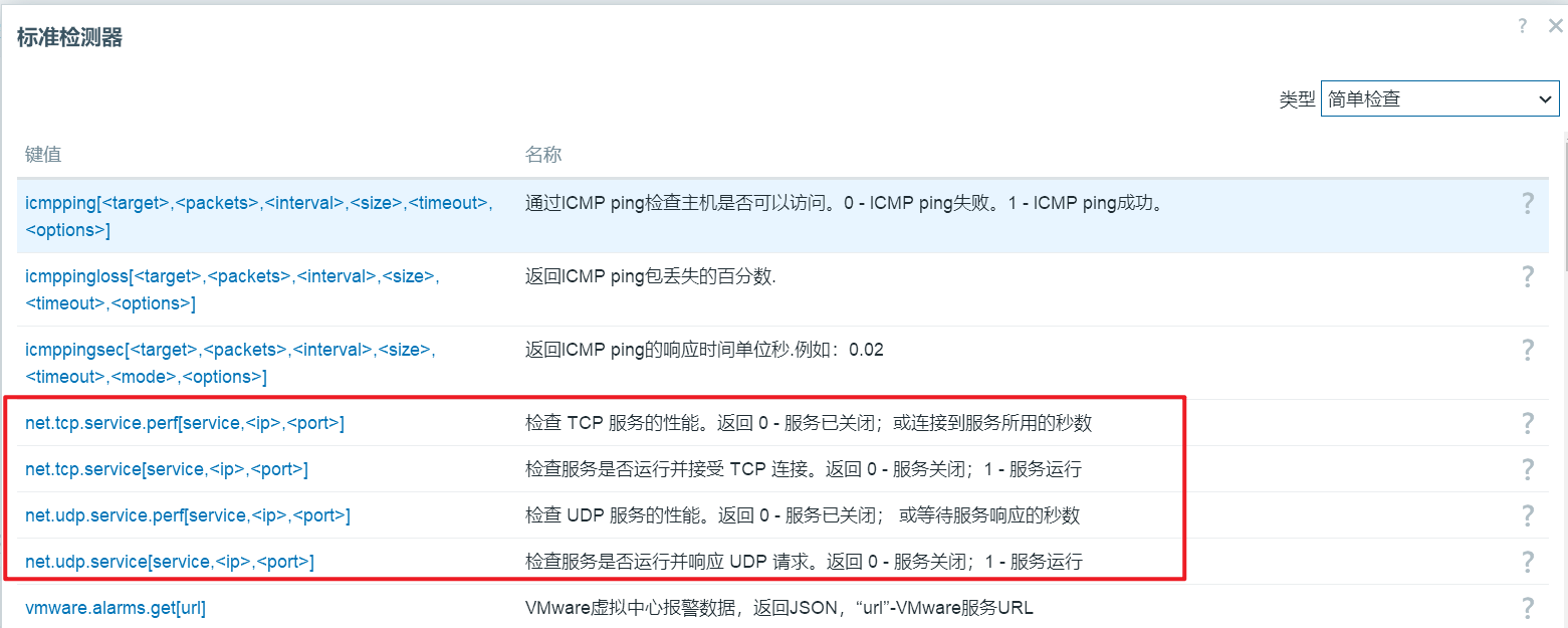 也可以基于服务端的简单检查进行监听,骑着net.tcp.service的参数需要填写service,因此智能识别zabbix预定的服务类型,不适合随机端口的监听,不是只连端口,而是会做简单协议校验,比 tcp 更“懂业务一点”。