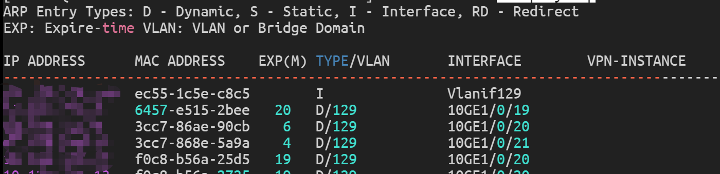 当在所有终端的网关上查看arp时,因为没有进行路由转发,交换机进行arp广播的时候,是在同一VLAN,没有经过三层转发,PC回复直接回复给了网关,因此是真实的终端PC的mac。