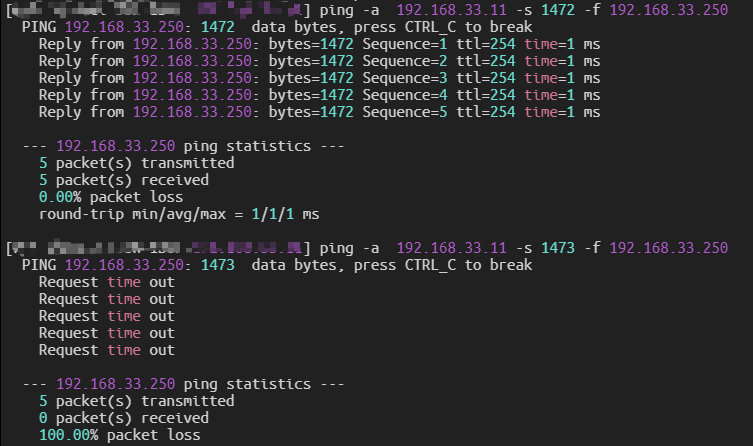 如果 1400 通过,1472 不通过 → 路径 MTU 更小,需加以排查/调整。