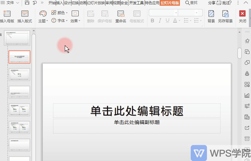 母版分为“主母版”和“版式母版”,更改主母版,则所有页面都会发生改变。