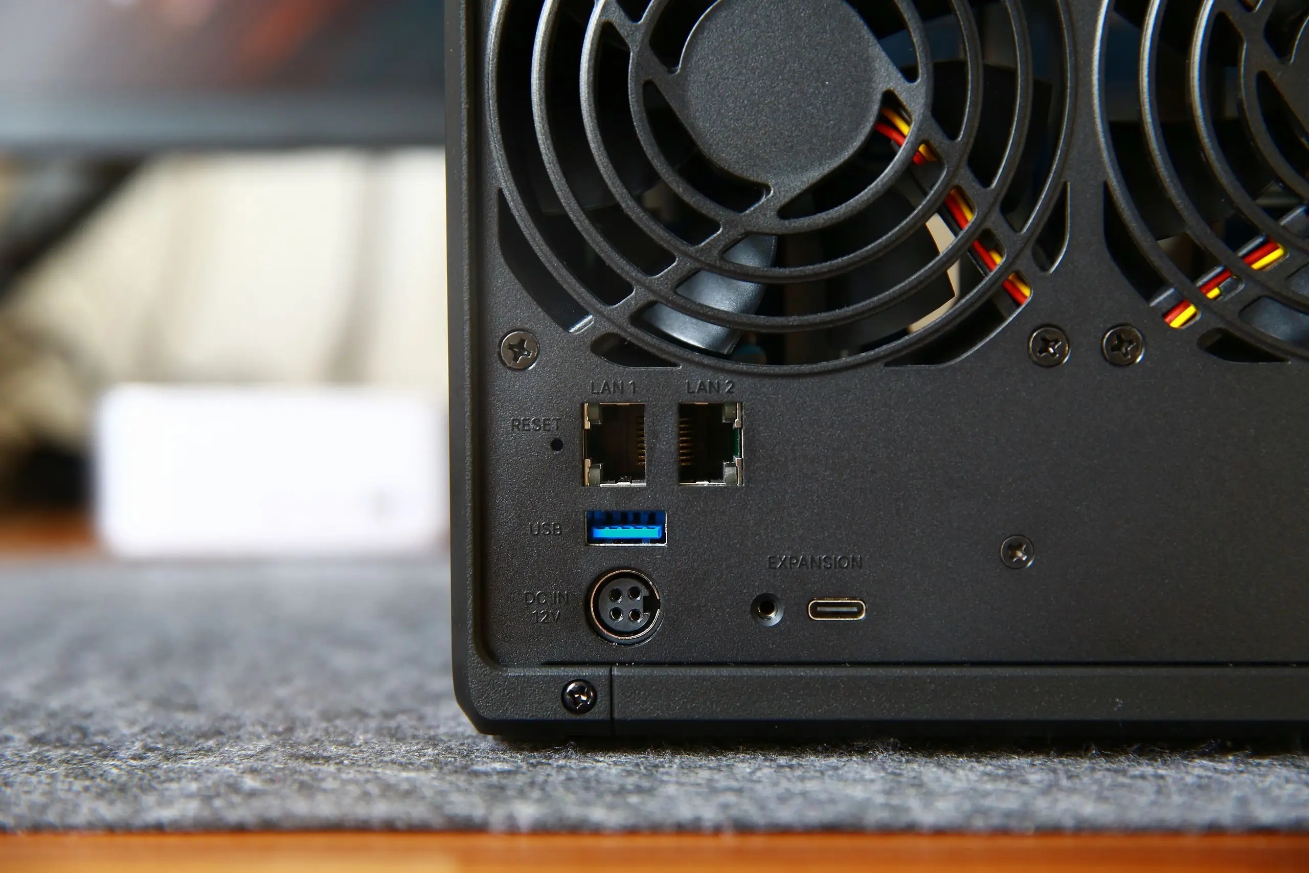 DiskStation DS923+拥有两条DDR4内存插槽,出厂预装单根4GB,最大支持32GB内存,实际可以读取并识别单条32G共计64G内存。接口方面,DiskStation DS923+拥有两个千兆网口,两个USB3.2 Gen1 Type-A接口,一个eSATA接口,内部还有一条规格为PCI-E 3.0x2网卡升级插槽。