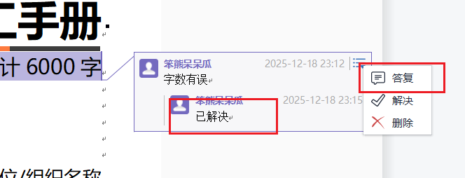 对于批注状态,也可以在确认无误的时候,选择解决或者删除,已解决批注会置灰。
