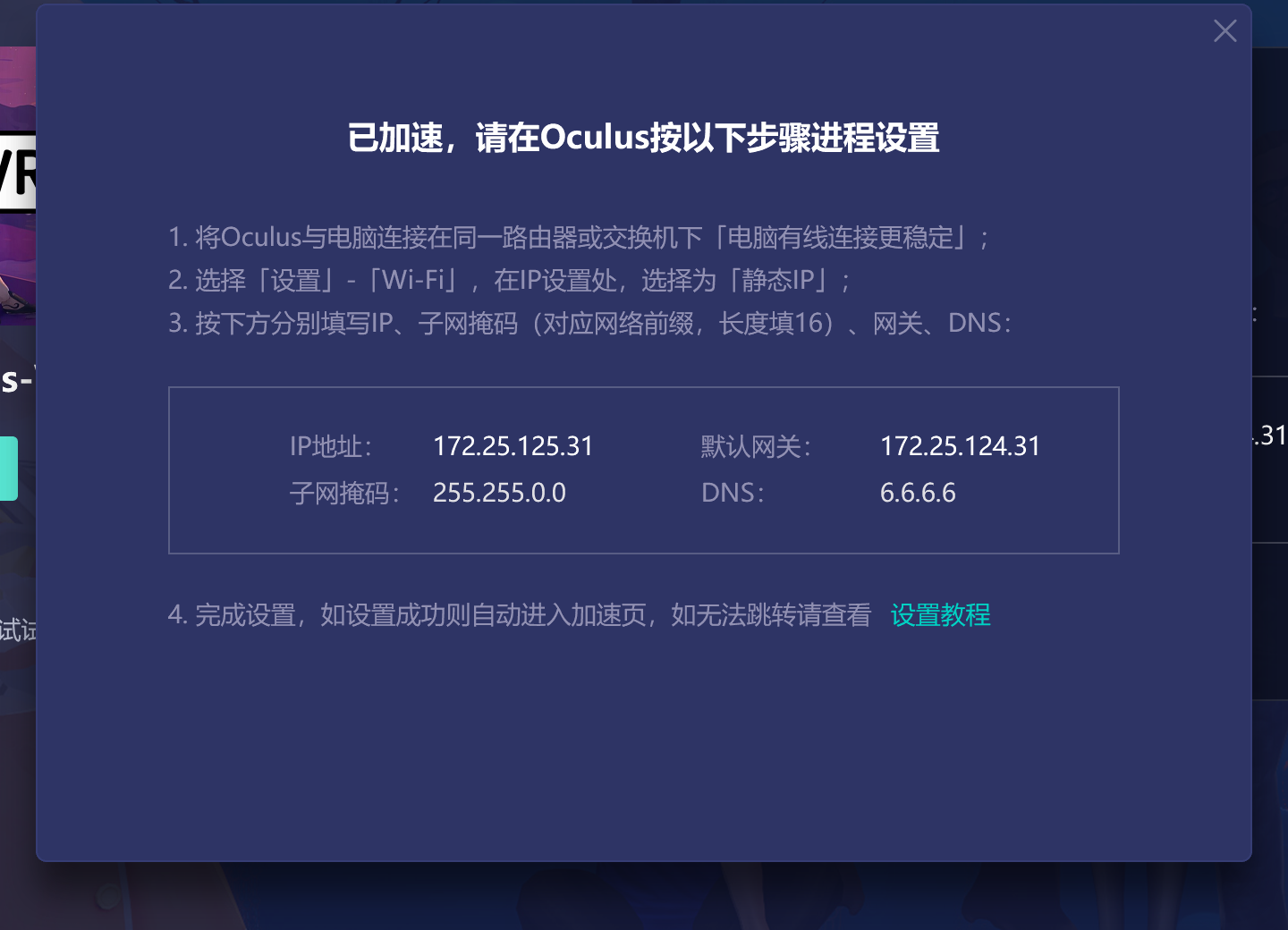 第二部:点加速oculus游戏后,下面会出现设置网络的步骤,然后连接你头显的网络,按顺序输入以下信息就可以。