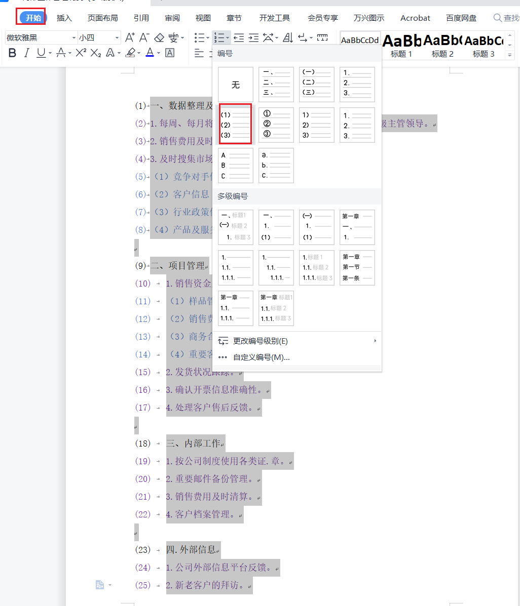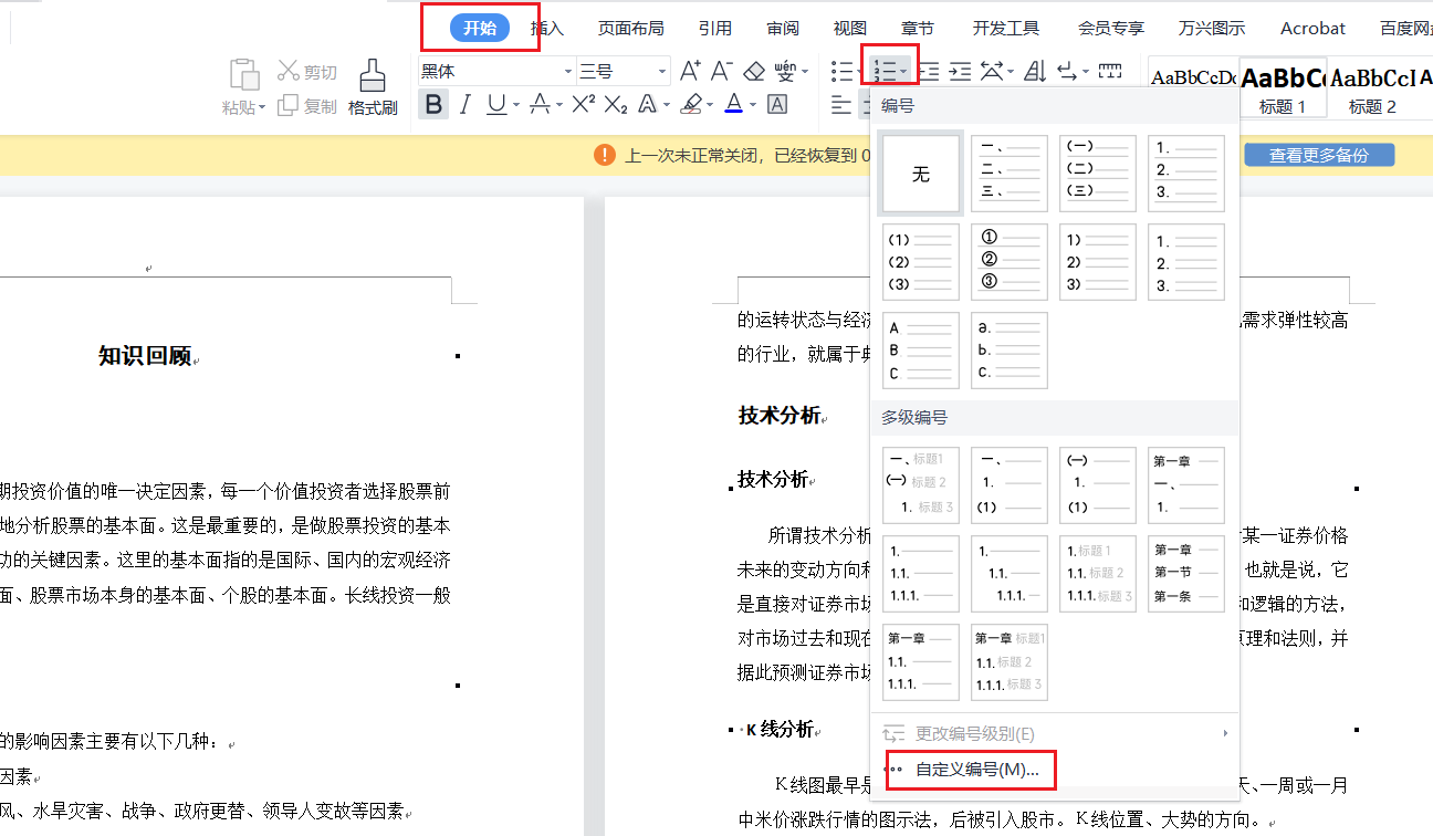 光标置于标题,然后选择开始选项卡,然后选择编号-自定义编号