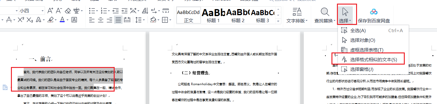 快速选中正文的方法,任意选中一段正文,然后单击选择,选择格式相似的文本