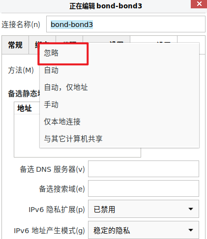 在 Bond 主接口配置界面中,配置 IPv4: