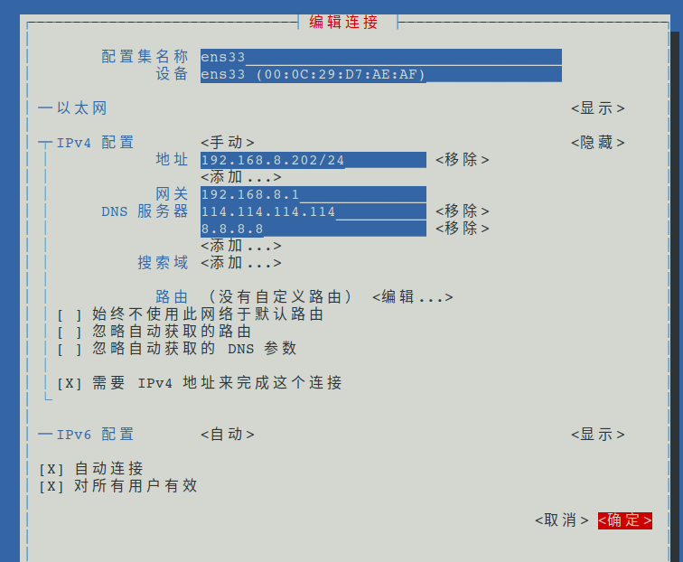 可以发现,通过nmtui修改的网卡自动连接,同步到了对应的网卡配置文件。