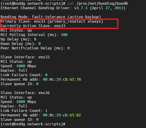 cat /proc/net/bonding/bond2如果是主备模式,正常输出会看到: