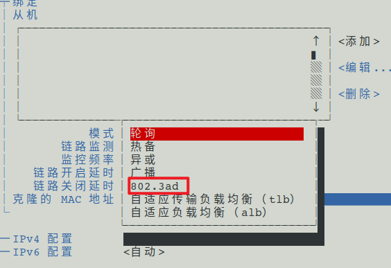 进入 Bond 配置界面后,会看到 Mode 选项。